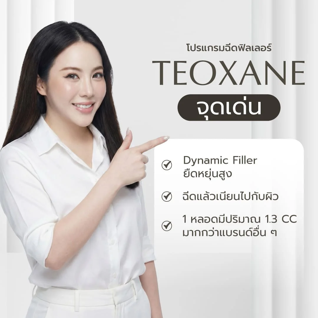ฟิลเลอร์ Teoxane จากสวิตเซอร์แลนด์ เมื่อฉีดไปแล้วผลลัพธ์จะดูเนียนกลืนไปกับผิว และมีความเป็นธรรมชาติ เมื่อมีการขยับใบหน้าจะไม่ขึ้นเป็นก้อน เป็นลำ เพราะเป็น Dynamic ฟิลเลอร์ มีจุดเด่นในเรื่องความยืดหยุ่น และปริมาณใน 1 หลอดมีทั้งหมด 1.3 CC ซึ่งมากกว่าฟิลเลอร์แบรนด์อื่น อีกทั้งผลลัพธ์คงอยู่ได้นานขึ้น